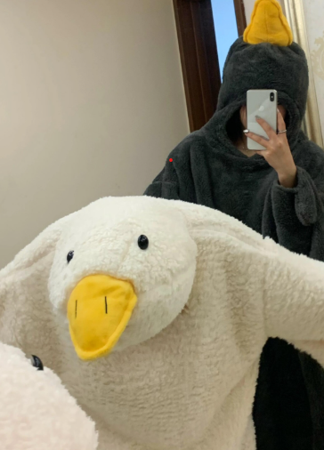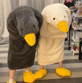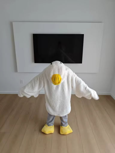 Giyilebilir kaz battaniyesi, başında sivri sarı bir gagası ve büyük beyaz kanatlarıyla...
