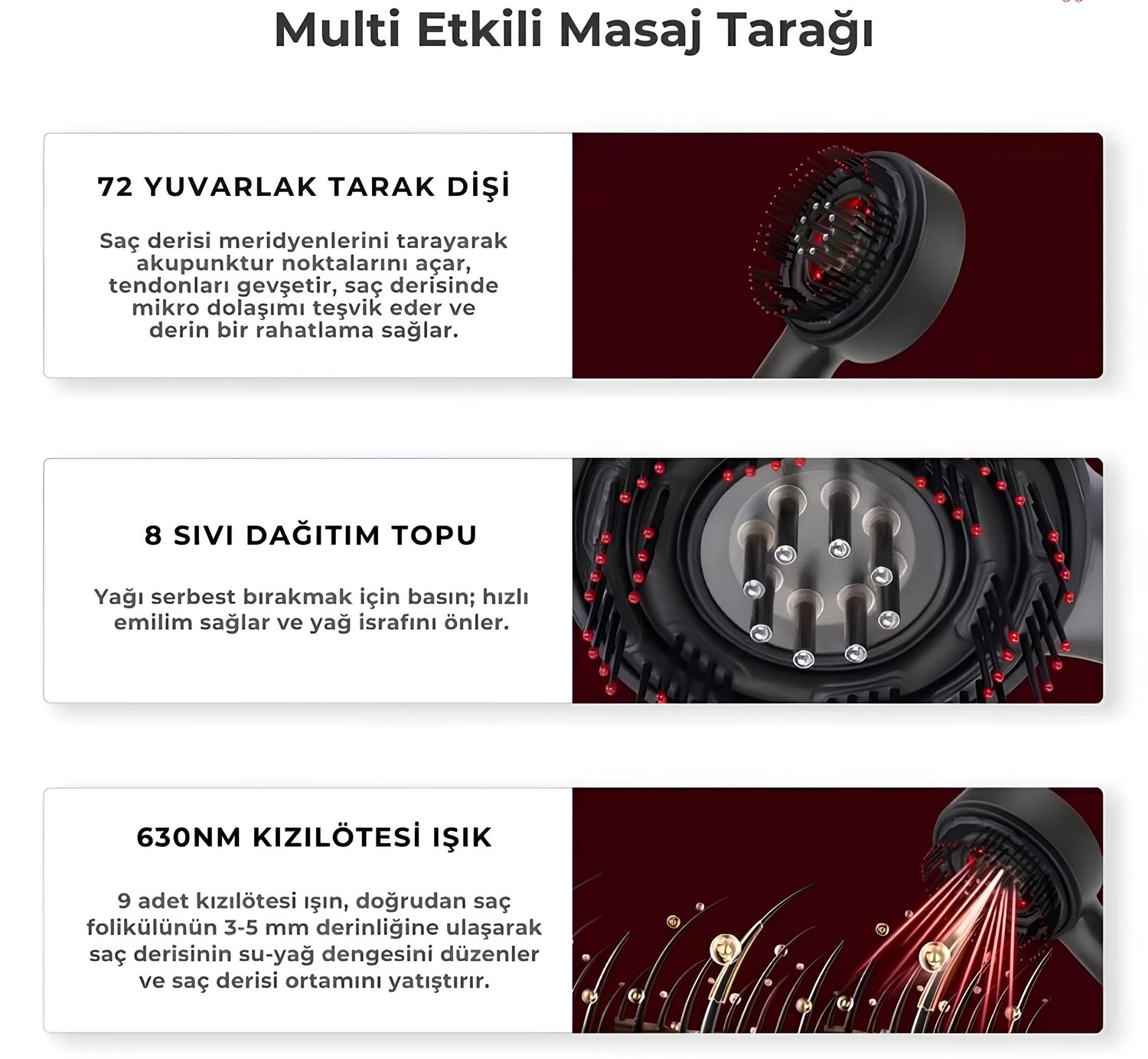 Red light therapy teknolojisiyle saç derisini uyararak kan dolaşımını artırır, bakım yağları için özel haznesi sayesinde besleyici etkisini derinleştirir. Şarjlı yapısıyla her yerde kolayca kullanılabilir, güçlü masaj başlıklarıyla saç köklerini canlandırır.